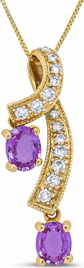 This unique pendant necklace is sure to turn heads. The pendant features a a ribbon of diamond accented 14K Yellow Gold weaving through down neckline. The diamond studded ribbon ends with 2 beautiful, natural pink sapphires. Radiating a glorious pink hue, the sapphires on this yellow gold drop pendant look simply enchanting. The sparkling diamond accents above the oval-shaped gems and the unique ribbon twist design further elevate their unmatched aura. This pendant necklace comes with an 18" inch box chain with a spring ring. Pink Sapphires are natural but may be treated for color.