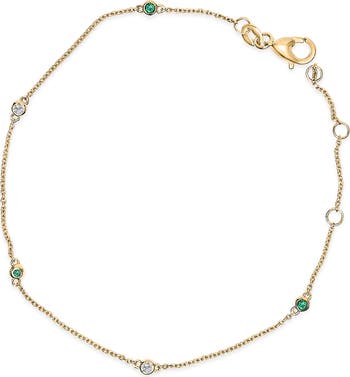 14K Yellow Gold Alternating Green Emerald and Diamond Bezel Station Chain Bracelet
