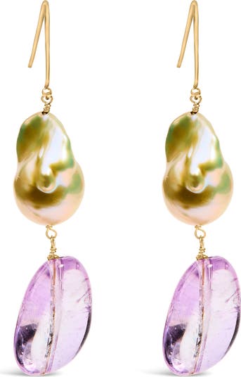 14K Yellow Gold Amethyst and Baroque Pearl Drop and Dangle Earrings