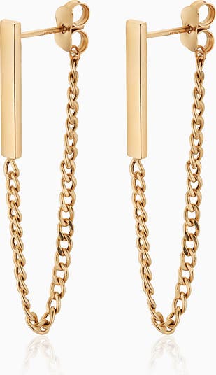 Our Carmine Curb Bar Drop Earrings are perfect for a basic tee, little black dress and everything in between.. Flat shiny links hang from a solid gold bar for a look that captures light at with your every move.