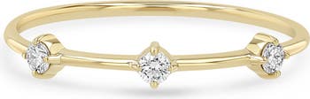 Three dainty prong-set round diamonds bring celestial sparkle to this stackable ring crafted from warm 14-karat yellow gold.