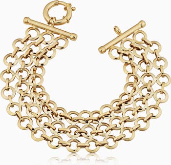 Three rows of circle-link chains make up our bold Disco Bracelet. Punctuated with solid gold bars at either end, this statement piece will shine whether you’re at the office or on the dance floor.