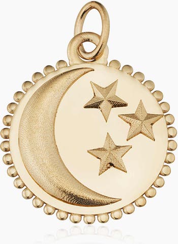 A luxurious blend of elegance and symbolic allure, our Goodnight Moon Medallion Pendant Charm will illuminate your style. Featuring a hand stamped sleeping moon, stars, and a delicately ribbed edging, it's the perfect piece to add style to your collection. Model imaged wearing our Catamaran Cable Chain (not included).
