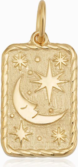 A luxurious blend of elegance and symbolic allure, our Goodnight Moon Pendant Charm will illuminate your style. Featuring a hand stamped sleeping moon, stars, and a delicately ribbed edging, it's the perfect piece to add style to your collection. Model imaged with Rimini Rolo Split Necklace and Connector Clasp (not included)