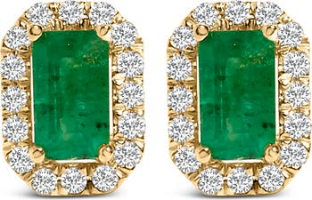 Immerse yourself in the unending elegance of these 14K yellow gold stud earrings, each presenting a mesmerizing, emerald-cut green emerald at its heart. Natural and treated delicately with oil to enhance its verdant hues, these 5x3 mm gemstones hark back to the regal opulence of bygone eras. Encapsulating each emerald, a radiant halo of natural white diamonds, cumulatively weighing 1/8 carat, adds a glittering contrast, further illuminating the exquisite octagonal silhouette of the setting. Designed with an eye for timeless sophistication and secured with comfortable push back closures, these earrings promise not just an accessory but a lifetime keepsake, subtly elevating everyday attire and enriching those special moments with a sprinkle of splendor.