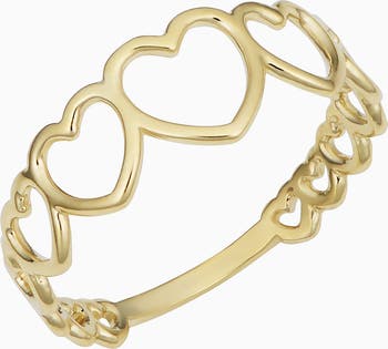Our Heart to Heart Ring is a dainty, stackable piece that will dress up your finger with a touch of romance. A series of graduated gold hearts sit side-by-side, leading up to the largest heart at the ring’s center.