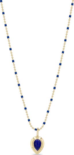 Vibrant enamel tubes punctuate the dainty ball-chain of a polished 14-karat gold necklace suspending a bezel-set pear-cut lapis lazuli pendant.