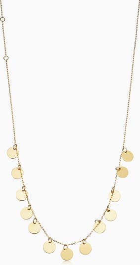 Thirteen gold discs are sprinkled along the chain of our Manhattan Choker. Each dangles free so that the necklace catches the light wherever you turn. Let this piece sparkle solo, or make it part of a layered look.