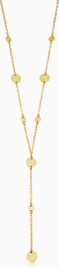The chic drop design of our Manhattan Lariat Station Necklace will never go out of style. This substantial piece features nine petite gold discs, varying in size, placed symmetrically along a delicate chain.