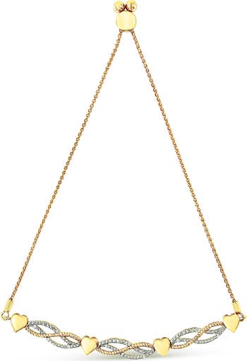 14K Yellow Gold Plated Silver 1/10 Cttw Diamond Wave and Hearts Bolo Bracelet