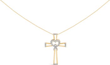 14K Yellow Gold Plated Silver 1/6 Cttw Diamond Heart and Ribbon Cross Pendant