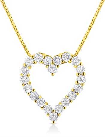 Celebrate someone you love with this stunning diamond open heart pendant necklace. This diamond necklace features a classic open heart made up of prong set round, brilliant cut diamonds set in genuine 14K Yellow Gold Plated Sterling Silver. The stunning pendant comes with a matching box chain necklace with a spring ring clasp. The contemporary yet classic 18" box chain complements any neckline beautifully. This authentic design is crafted of real 92.5% sterling silver that has been electro-coated with genuine 10K gold, ensuring it will keep a tarnish-free shine for years to come. Both pretty and personal, this romantic diamond heart pendant necklace is sure to radiate romance. This open heart design features 20 natural, sparkling diamonds. This sweet necklace makes a perfect gift to show someone you care, or as a way to remember someone close to your heart. It's a classic and feminine piece she'll want to show off every day.
