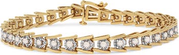 Gold top and bottom links frame single, round-cut diamonds to create this magnificent wave-like design on this 2 carat bracelet. Round-cut diamonds in a classic miracle setting are embellished in the finest 14k yellow gold plated .925 sterling silver. This piece will sit delicately on your wrist and shine bright with any outfit you pair it with. It is 7.25 inches long and comes with a box with clasp for a secure fit. You will love the romantic feel of this glamorous bracelet.