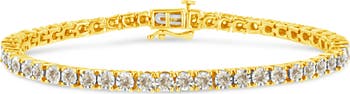 This tennis bracelet is a classic and will look glamorous on your wrist! This gorgeous piece is embellished in the finest 14k yellow gold plated .925 sterling silver. Boasting an impressive a total diamond weight of 3 cttw, this piece is set with round-cut diamonds in a unique miracle setting. The diamonds are L-M in color and have a I2-I3 clarity. This bracelet is perfect for any formal occasion, and will impress all those who set eyes upon it.
