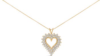 Two rows of natural, sparkling diamonds are set in warm 14K yellow gold plated .925 sterling silver to create a stunning open heart design in this beautiful pendant necklace for her. This pendant has 46 round diamonds, that are I1-I2 in clarity and K-L in color; each diamond is meticulously set in an enchanting prong setting. The pendant hangs from an 18 inch box chain with a spring mechanism, and is the perfect gift for any occasion. This sweet necklace makes a perfect Valentine's Day gift, or as a way to remember someone close to your heart. It's a classic and feminine piece she'll want to show off every day.
