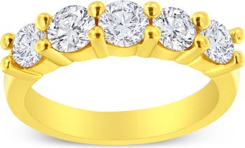 Classic and elegant, this 14k yellow gold plated sterling silver ring is a must have piece. 5 dazzling round cut diamonds in a prong setting line the top of a warm yellow gold band. 1 1/2ct TDW of diamonds are showcased in this ring.