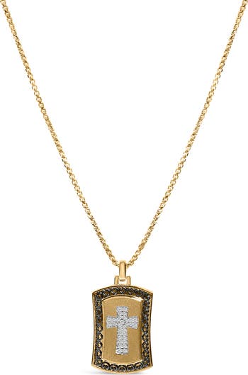Imbued with spiritual elegance, this exquisite pendant merges the revered symbols of faith and valor—a luminous cross nestled within a sleek dog tag frame. Artfully crafted from .925 sterling silver and bathed in radiant 14K yellow gold, this piece is a testament to both fine craftsmanship and modern design. The pendant glistens with a quarter carat of natural diamonds, their J-K color and I2-I3 clarity sparkling with celestial grace against the compelling contrast of black rhodium accents. Each diamond, ethically sourced, adds a touch of divine sparkle to the wearer's everyday moments. Suspended from a sturdy 22-inch cable chain secured by a robust lobster claw clasp, this necklace promises both comfort and style. It is an emblem of timeless elegance suitable for a myriad of occasions, seamlessly transitioning from daytime charm to evening sophistication.