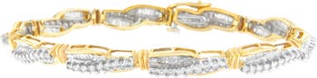 When you've found someone to share life's journey, you want to let them know. This bracelet is an elegant reminder, filled with three carats of glittering round and baguette diamonds that wind their way around an intricate yellow gold setting for a gorgeous finish.