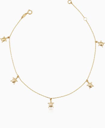 Designed with the Caribbean mind, our Sea Turtle Anklet features five intricately crafted solid gold turtles stationed between a rolo chain. Wear it with a pair of pants or skirt to shine up your look!