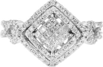 A gold and diamond engagement composite ring. This triangular ring is made with 96 round and 16 princess cut diamonds in a prong and invisible setting, respectively. The diamonds are set in a lustrous 14k white gold band.