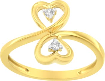Present this delicate and lovely Dual Heart Diamond Ring as a striking symbol of your undying love. This captivating ring showcases 2 gorgeous round cut accented diamonds, beautifully prong set and rendered to glowing perfection on luminous 14 karat yellow gold. Total diamond weight is 1/20 ctw.