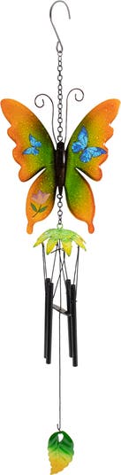 There's nothing like the sound of windchimes dancing in the wind. This beautiful butterfly chime adds color and music to any outdoor space. Hang anywhere to enjoy the epitome of summer sounds. Metal butterfly outdoor windchime 4 hanging tube chimes Easy to hang from metal chain with hook Dimensions: 15.75"H x 5"W x 2.25"D Material(s): metal