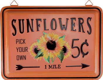Welcome the Fall season with this "Sunflowers" wall plaque. Perfect to display in kitchens and dining areas. Crafted with metal, and printed with embossed lettering over an orange background with a black border. Features: Metal Sunflowers Fall wall plaque Reads: Sunflowers Pick Your Own, 5¢, 1 mile Black print embossed lettering over an orange background with a black border Accented with bright yellow and orange sunflowers Ready to hang with keyhole hooks on the back Recommended for indoor use only Dimensions: 11"H x 15"W x 0.6"D Material(s): metal