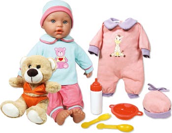 BABY DOLL BILLIE & LITTLE BEAR SET - BLUE & PINK 15": Meet Baby Billie the adorable 15” baby doll with expressive blue eyes, accompanied by an adorable little bear. Dressed in a removable, high-quality outfit and hat, Baby Billie encourages imaginative play as children can effortlessly change their baby doll's clothes, fostering fine motor skills and creative expression. Little Bear serves as the perfect companion, adding an extra touch of sweetness to your child's playtime. Baby Billie comes complete with a bottle, bowl, and cutlery, creating opportunities for pretend mealtimes and heartwarming cuddles during bedtime rituals. This delightful baby doll is designed to inspire loving role-play, supporting emotional development, and providing a platform for children to express their feelings. With a focus on nurturing role-play, Baby Billie gently encourages children to engage in imaginative scenarios, from choosing outfits to role-playing mealtimes and tender cuddles with the bear. Playing with dolls is not only fun but also a valuable tool for children to experience everyday situations, helping them develop confidence and social skills. Suitable for ages 2 and above, this baby doll set promises endless moments of joy, growth, and imaginative exploration for your child. Bille Baby makes a thoughtful and delightful gift, sparking smiles and imaginative play in every child.
