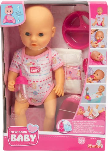 SIMBA TOYS NEWBORN BABY DOLL WITH ACCESSORIES - Nurture and care for your very own little one with the Simba Toys Newborn Baby with Accessories! This adorable 14.96-inch baby doll is dressed in soft, cuddly pajamas, making her the perfect companion for little caregivers. She comes with a full set of realistic accessories, including a bottle for drinking water, a potty for when she needs to go, a diaper, a pacifier, and even eating utensils! This interactive baby doll helps teach essential life skills through imaginative play. Whether it’s bottle-feeding, potty training, or pacifier soothing, every little detail encourages nurturing behavior and creative exploration. Designed with realistic features and a gentle expression, this baby doll makes playtime feel just like real-life caregiving. A wonderful gift for young children looking to embrace their nurturing side! With the Simba Toys Newborn Baby, kids can develop empathy, responsibility, and fine motor skills while engaging in hours of heartfelt play. INCLUDES: 1 Baby Doll, 1 Bottle, 1 Pacifier, 1 Potty, 1 Diaper, and 3 Eating Accessories.