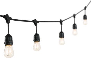 Add instant lighting to your patio, deck or balcony with our bright Outdoor Edison Lights; 15 clear glass bulbs are spaced 36" apart along a 48' cord. Industrial-style lights can be used with a dimmer for a warm rustic look at a wedding, party, or camping. Heavy duty sockets stand up to rain and wind. Leave them up all summer for entertaining outside, or keep them up all year in mild climates.