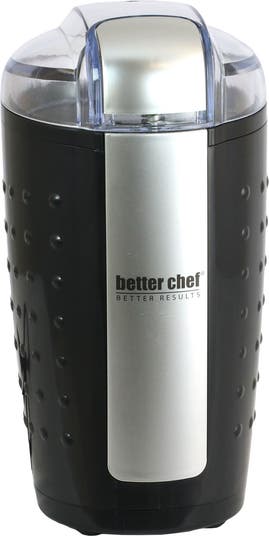 Compact and POWERFUL, the Better Chef Power Blade Coffee Grinder's 150-Watt motor will grind not just coffee, but nuts, spices, and more. Whether you want some rough chopped nuts for an ice cream sundae or coffee beans ground to dust for your morning joe, with the Better Chef Grinder, it is simply a matter of how long you keep the unit running. With the easy-grip textured surface and one-touch operation, you can hold the unit in place while the durable stainless steel blades make quick work of whatever you need pulverized. It also comes with a safety locking mechanism, so no worries about a plume of dust erupting from the grinder while it is running. And with a 100G/3.5oz capacity, you'll have enough grounds to get even the heaviest drinker through the morning. When you're finished the unit even has cord storage built in, just put in the cupboard and you'll never have to deal with a hanging power cable. We all love our coffee freshly ground. No one wants some week old, stale, store bought, powder. So give the Better Chef grinder, a shot, go through that extra 2.5 minute grinding prep, and you will have coffee as it was meant to be drunk, fresh, fulfilling, and perfect for that morning jolt! Measures: 7" x 4" x 4" 1.5 LB Capacity:3.5 FL OZ * 150 Watt motor can grind coffee, nuts, spices and more * One touch operation with safety lock * durable stainless steel blades * 100G/3.5OZ stainless steel grinding chamber * Easy grip textured surcace * Cord Storage Item Dimensions: 4.00" x 4.00" x 7.00" Item Weight: 1.50lbs