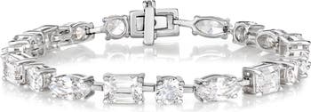 Add a touch of refined glamour to any look with this multi-shaped Diamond Crystalline tennis bracelet. Featuring emerald, marquise, and round-cut stones set in sterling silver with a choice of platinum, 18k rose, or yellow gold finish, this 16-carat bracelet brings a distinctive sparkle.
