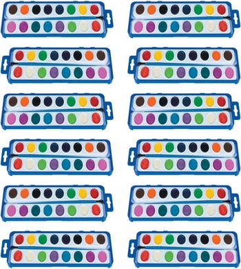 Inspire future painters with this set of 16 Color Washable Watercolor Paint Trays. These are great for promoting creativity, fine motor skills, and hand-eye coordination. Encourage children to identify the different colors as they use them to create a unique masterpiece. Plastic trays give each child their own washable semi-moist color palette. This set includes 12 trays of 16 watercolor paints.