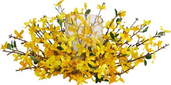 Brighten your space with a sunny Forsythia Candle Holder. Crafted from high-quality materials, wispy, artificial yellow blooms surround a light candle holder, perfect for setting the mood in any space. Inspired by nature, the flowers are incredibly lifelike and will last longer than a fresh bouquet. With a length of 16", display in any table top. Perfect for a dining room, coffee table or an office. Silk arrangements are manufactured using synthetic materials, such as polyester material or plastic, and are well designed and constructed to be life-like in appearance. This item will need to be re-shaped when removed from the secure box to allow it to reach its fullest size. Your artificial arrangement will look beautiful for years to come; simply wipe clean with a soft dry cloth when needed.