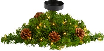 Set your home aglow this holiday season with the help of this artificial candelabrum; specifically designed as an elaborate candle holder, it's intricately designed from a rich overgrowth of realistic looking pine greenery, handsomely accented with miniature faux pinecones, all carefully surrounding a candle holder. Better yet, this seasonal centerpiece comes already pre-strung with 35 lights, eliminating pre-tangled messes and holiday stress. Reaching 16” long, this winter-ready decorative accent would make an enchanting addition to a mantle or a holiday-inspired tablescape. Silk arrangements are manufactured using synthetic materials, such as polyester material or plastic, and are well designed and constructed to be life-like in appearance. This item will need to be re-shaped when removed from the secure box to allow it to reach its fullest size. Your artificial arrangement will look beautiful for years to come; simply wipe clean with a soft dry cloth when needed.