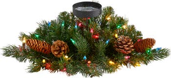 Get your home twinkling this holiday season with the help of this artificial candelabrum; specifically designed as an elaborate candle holder, it's intricately designed from a rich overgrowth of realistic looking pine greenery, handsomely accented with miniature faux pinecones. Better yet, this seasonal centerpiece comes already pre-strung with 35 multicolored lights and lightly dusted with a mix of high-shine glitter and fake snow to evoke the ultimate winter wonderland. Reaching 16” long, this winter-ready decorative accent would make a snowy addition to a mantle or a holiday-inspired tablescape. Silk arrangements are manufactured using synthetic materials, such as polyester material or plastic, and are well designed and constructed to be life-like in appearance. This item will need to be re-shaped when removed from the secure box to allow it to reach its fullest size. Your artificial arrangement will look beautiful for years to come; simply wipe clean with a soft dry cloth when needed.