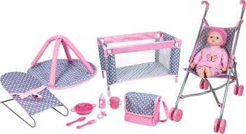 - 12-PIECE PLAYSET: Includes a folding stroller, travel bed or playpen, bouncer, and a carry bag filled with six accessories—offering everything young caregivers need to feed, care for, and entertain their baby doll.