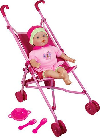 DOLL UMBRELLA STROLLER SET: PINK - Take your favorite baby doll on exciting adventures with this charming Lissi Umbrella Stroller Set! This colorful pink stroller comes complete with a 16" baby doll dressed in an adorable pink and green outfit featuring a sweet butterfly motif and matching hat, making it the perfect companion for on-the-go play. The stroller’s lightweight, fold-up design allows for quick setup, easy storage, and effortless transport—ideal for play at home, in the park, or while visiting friends. The set includes three feeding accessories—a plate, fork, and spoon—so little caregivers can enjoy imaginative mealtime fun wherever they go. With its cheerful matching theme and realistic stroller design, this set inspires nurturing role-play, encourages storytelling, and helps children build social and emotional skills as they care for their doll. Whether it’s a pretend walk around the neighborhood or a playful picnic indoors, this adorable stroller set brings hours of fun and creativity to playtime. Perfect for children who love to take their dolls along on every adventure. Recommended for ages 3 and up.