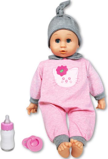 - NURTURE & CARE ACCESSORIES: This 15.75" baby doll comes with a bottle, pacifier, soft one-piece garment with a cat and flower design, and a matching cap. Kids can create heartwarming moments from feeding to snuggling and beyond.