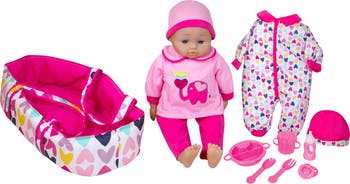 16" TALKING BABY & ACCESSORIES: PINK - The Lissi 16" Talking Baby Doll with Accessories is the perfect interactive companion for children who love to nurture, imagine, and care for their dolls. Dressed in an adorable pink outfit featuring a sweet elephant detail, this soft and cuddly baby doll is designed to feel just like a real little one in your child’s arms. With a simple press of her tummy, she comes to life with six realistic baby sounds—from gentle giggles to soft cries—that make playtime even more engaging and lifelike. This delightful 8-piece set includes everything needed for hours of pretend play: an extra outfit with a heart design and matching hat for dress-up fun, a cozy carry bed for naps and travel, and essential feeding accessories including a sippy cup, bottle, plate, spoon, fork, and pacifier. Perfect for both playtime and bedtime cuddles, this charming doll encourages empathy, creativity, and caring role-play while giving children the joy of their very own baby to love. Recommended for ages 3 and up, the Lissi 16" Talking Baby Doll Set is sure to become a treasured favorite in any young caregiver’s collection.