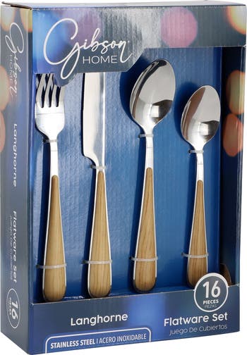 Upgrade your dining experience with the Gibson Home 16-Piece Langhorne Stainless Steel Flatware Set. This elegant flatware set, featuring a stylish brown and silver design, is perfect for both everyday use and special occasions. Crafted from high-quality stainless steel, it promises durability and long-lasting shine, while the unique faux wood handle detail adds a touch of rustic charm to your table setting. Designed for service for four, this set includes four dinner forks, four dinner knives, and four teaspoons, making it ideal for family meals and entertaining guests.Not only does this dishwasher-safe flatware set provide effortless cleanup, but its ergonomically rounded bottom handles ensure comfort during every meal. For best results, remember to avoid citrus-based dishwashing liquids to maintain the beautiful finish. Whether you're hosting a dinner party or enjoying a casual family dinner, the Gibson Home Langhorne Flatware Set will impress with its combination of style and functionality. Enhance your dining table with this chic and durable flatware set, making every meal a memorable occasion.