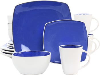 Set the table with the solid style of the Gibson Elite Soho Lounge 16 Piece Stoneware Dinnerware Set in Cobalt. Every piece features a matte white exterior with a bold glossy cobalt accent. The blue tint compliments the color of any meal. Its stoneware construction is dishwasher safe and microwave safe for every day convenience. Show off at dinner parties, brighten up your home made dishes, or enjoy your favorite foods with the family.