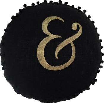 16" Round Embroidered Pillow with Pom Pom Trim "&" Design in Gold Script