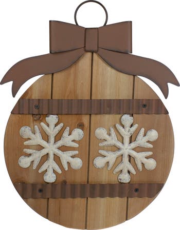 The snowflakes are falling n your home on this hanging wood ornament! This wall decor adds a bit of country to your Christmas festivities this year. Hang this ornament in your home or on your door to welcome your guests! Features: Hanging wood ornament with white snowflake cutouts Two white snowflakes made out of metal 2 variegated metal stripes Ornament is topped with a metal bow Comes ready to hang on a metal ring Dimensions:16"H x 12.75"W x 1.5"D Material(s):metal/wood