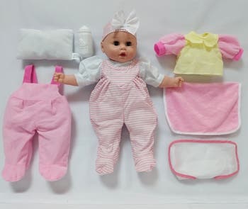 - Accessories include a 16" soft body baby doll, dressed in stripped overalls with matching headband. a pillow, a baby bottle, overalls, shirt, baby blanket, and diaper bag.