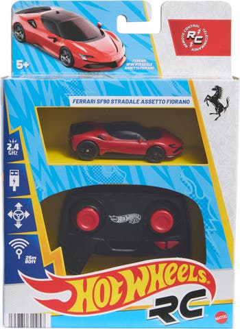 Take remote-control driving to the next level with this Ferrari SF90 Stradale Assetto Fiorano. This speedy vehicle can race on and off Hot Wheels tracks (sold separately) and has a booster button to speed through loops and stunts. The full-function remote control has a frequency of 2.4 GHz to prevent interference when challenging other racers.