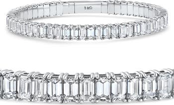 This classic women's bracelet features 51 huge emerald cut lab grown diamonds. All diamonds are prong set in a 14k white gold mounting. The bracelet features a double lock for security and durability. The mounting has good flex and beautiful enough to wear every day.