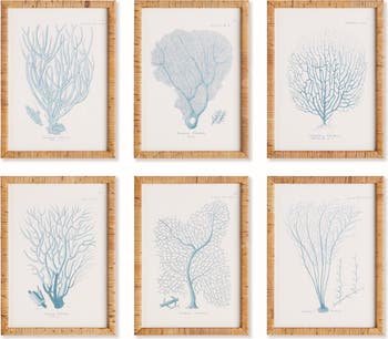 As elegant in style as they are in scale, this set of six sea fan and coral prints is quintessential upscale coastal chic. The soft, indigo tone and rattan-wrapped frames make them a beautiful choice for home or office.