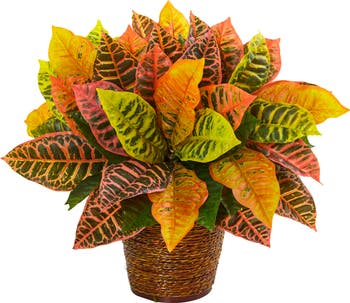 Add explosive colors to empty spaces with this artificial garden croton plant flaunting countless layers of fiery, realistic foliage in naturally occurring hues - all of which feel real to the touch. Standing 17” high from a basket planter, this multicolored plant can easily bring life to bare spaces.