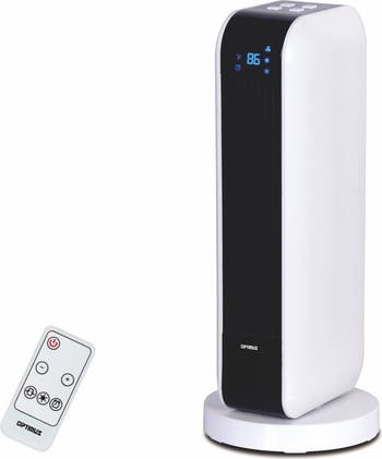 This Optimus 17 in. Oscillating Tower Heater helps you keep your living space warm and cozy. It features a modern tower design, and has two heat settings for 750 W and 1,500 W. This electric ceramic heater also has safety and protection settings and space-saving housing. An overheat protection circuit and tip-over safety switch helps prevent mishaps and gives you peace of mind. Item Dimensions: 7.00" x 7.00" x 17.00" Item Weight: 5.00lbs